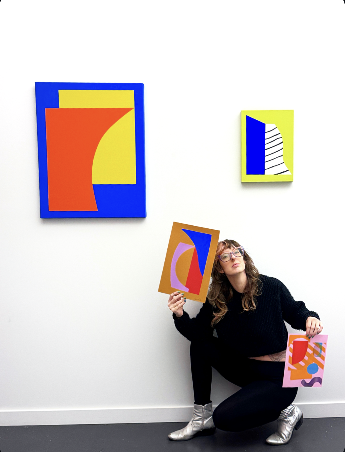 With a graphic arts practice somewhere between art and design, her bright work serves those with an affinity for non objective saturated colors and forms, improvisational compositions, and graphic tactile textures.